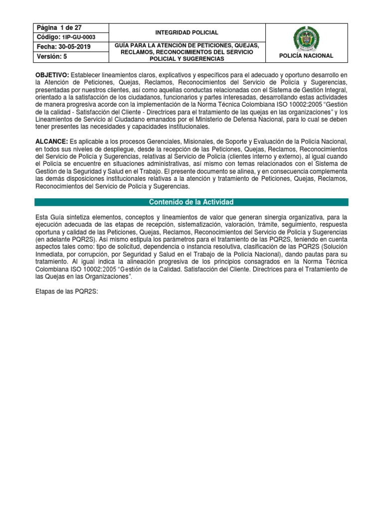 01 5 de 10 4. Para ello lo podrá hacer identificándose ante la institución o anónimamente. Las oficinas de atención al ciudadano de la policía nacional recepcionan tramitan gestionan e informan sobre las peticiones quejas o reclamos reconocimientos del servicio y sugerencias como también monitorean los espacios de participación ciudadana adelantadas por la institución facilitando al ciudadano la intervención vigilancia y evaluación a los procesos así mismo el acceso. La guía para la atención de peticiones quejas reclamos reconocimientos del servicio policial y sugerencias sintetiza elementos conceptos y lineamientos de valor que generan sinergia organizativa para la ejecución adecuada de las etapas de recepción sistematización valoración trámite seguimiento respuesta oportuna y con calidad.